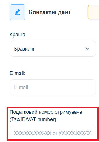 Також хочемо повідомити, що для вашої зручності в Особистому кабінеті Укрпошти та при оформленні відправлень через API реалізовано спеціальне поле для внесення податкового номера отримувача (CPF/CNPJ) під час створення відправлення до Бразилії. Рекомендуємо заздалегідь запитувати ці дані у вашого покупця та вносити їх у відповідну форму